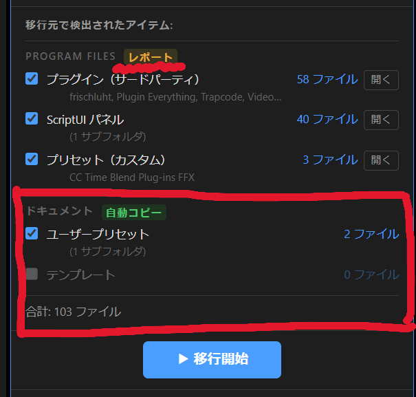 AE Moverはレポートで警告を出しますが、コピー前に各プラグインの公式サイトで対応バージョンを確認してください。